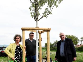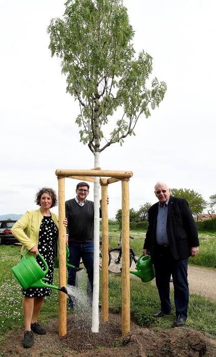 Bürgermeisterin Prof. Dr. Diana Pretzell, Alexander Manz, Vorsitzender Schutzgemeinschaft Deutscher Wald - Kreisverband Mannheim (SDW) und Gunter Heinrich, Vorsitzender Bürgerverein Vogelstang gießen eine neugepflanzte Elsbeere an.