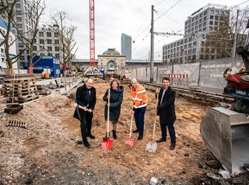 Im Bild von links nach rechts: Christian Specht, Erster Bürgermeister und ÖPNV-Dezernent der Stadt Mannheim, Prof. Dr. Diana Pretzell, Bürgermeisterin der Stadt Mannheim, Marcus Geithe, Geschäftsführer der MV Mannheimer Verkehr GmbH, sowie Moritz Feier, Pressesprecher der Rhein-Neckar-Verkehr GmbH.