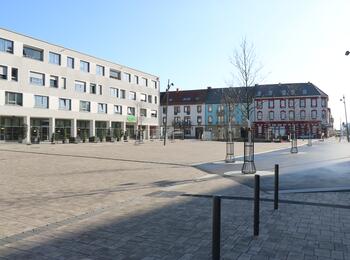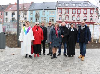 Bürgermeisterin Prof. Dr. Diana Pretzell (mitte), Bürgermeister Ralf Eisenhauer (4. v. l.) und Erster Bürgermeister Christian Specht (3. v. r.) freuen sich über die Fertigstellung des Taunusplatzes