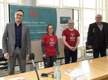 Freuen sich gemeinsam über die Special Olympics Landes-Sommerspiele in Mannheim (von links): Sportbürgermeister Ralf Eisenhauer, Jennifer Kurz und Michael Lofink (Gesichter der Spiele) sowie SOBW-Präsident Mathias Tröndle.