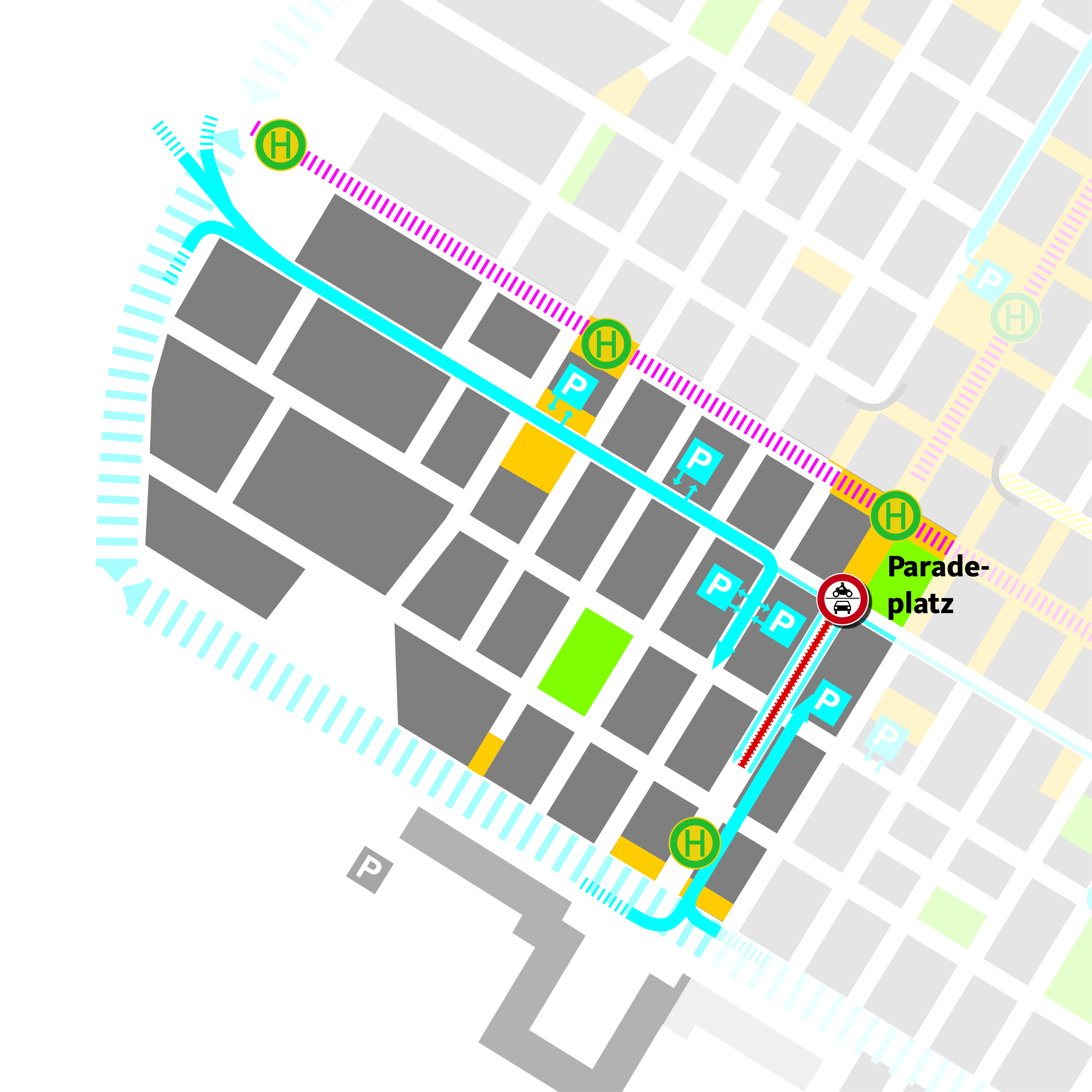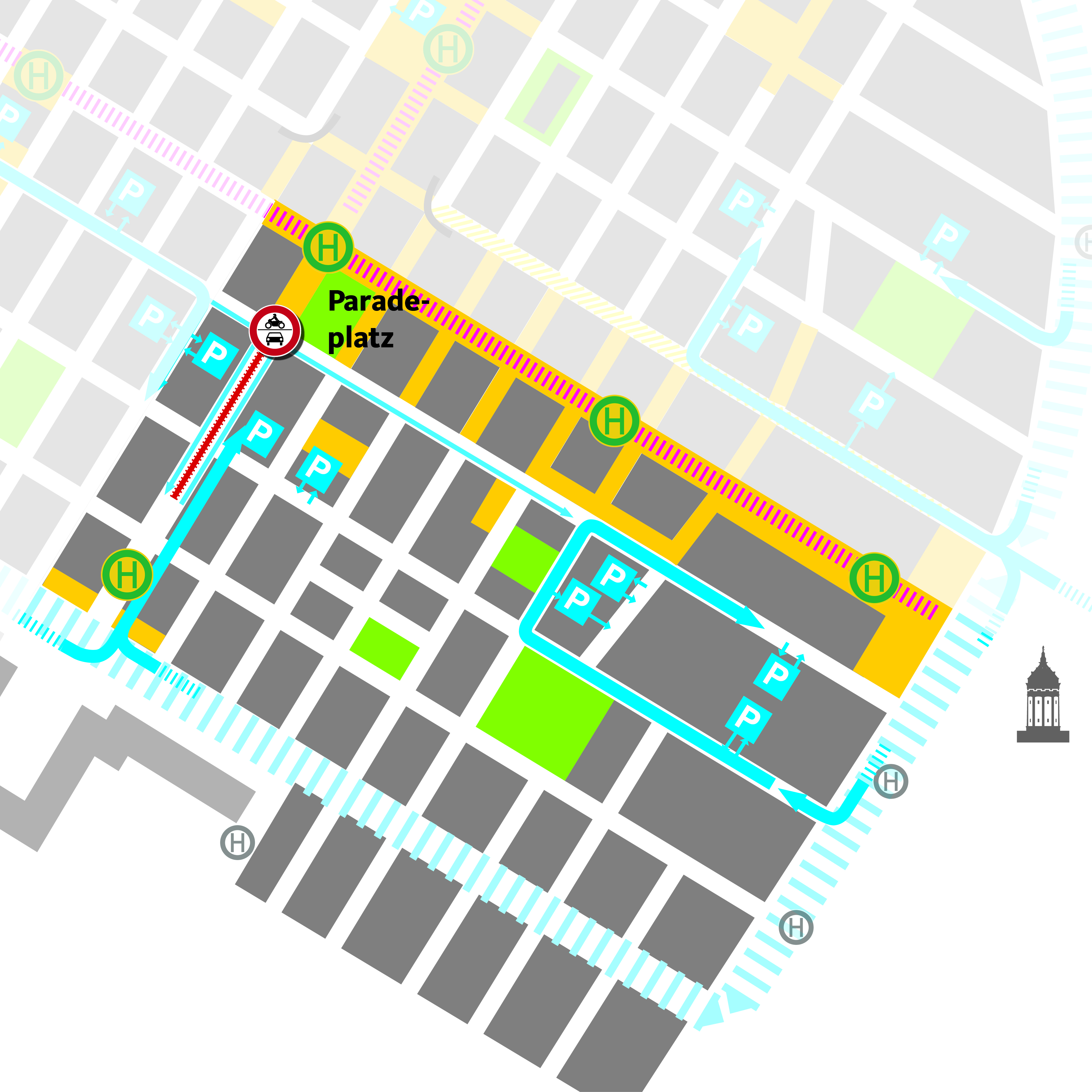 Mit der Unterbrechung des Durchfahrtsverkehrs in dr Kunststraße ist es weiterhin möglich, vom Schloss über die Kurpfalzstraße nach rechts in die Kunststraße einzufahren. Ale Parkhäuser sind uneingeschränkt erreichbar.