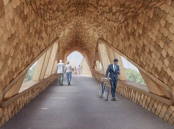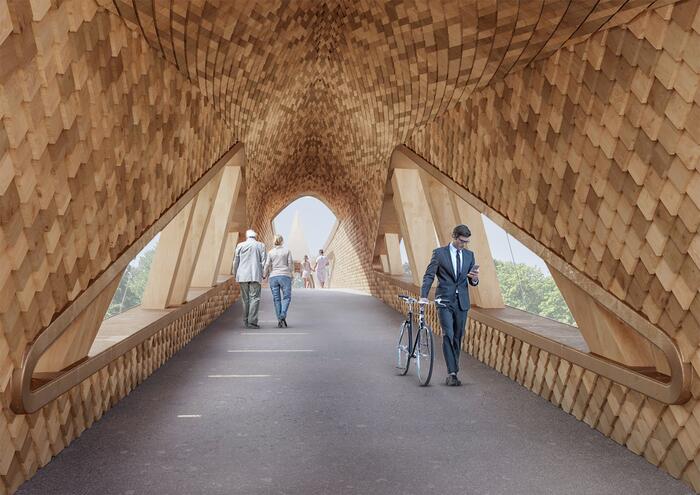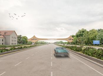Der Entwurf für die TAYLOR Brücke sieht eine Holz-/Stahlbetonverbundkonstruktion in markanter zeichenhafter Silhouette vor. Die geplante Ausführung lehnt sich an das historische Thema der gedeckten Holzbrücken aus dem Alpenraum an. Das Überqueren der Bundesstraße wird dadurch zum räumlichen Erlebnis.