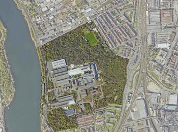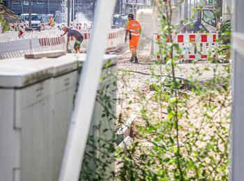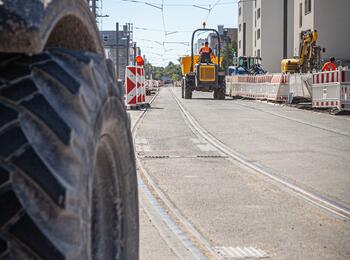 Philipp Knerr, Planung Bau bei der MWSP, Andrea Böttger, Projektleiterin der rnv, Marcus Geithe, Geschäftsführer der MV Mannheimer Verkehr GmbH (MV), Oberbürgermeister Christian Specht sowie Martin in der Beek, Technischer Geschäftsführer der Rhein-Neckar-Verkehrt GmbH (rnv), vor einem Teil der neuen Strecke