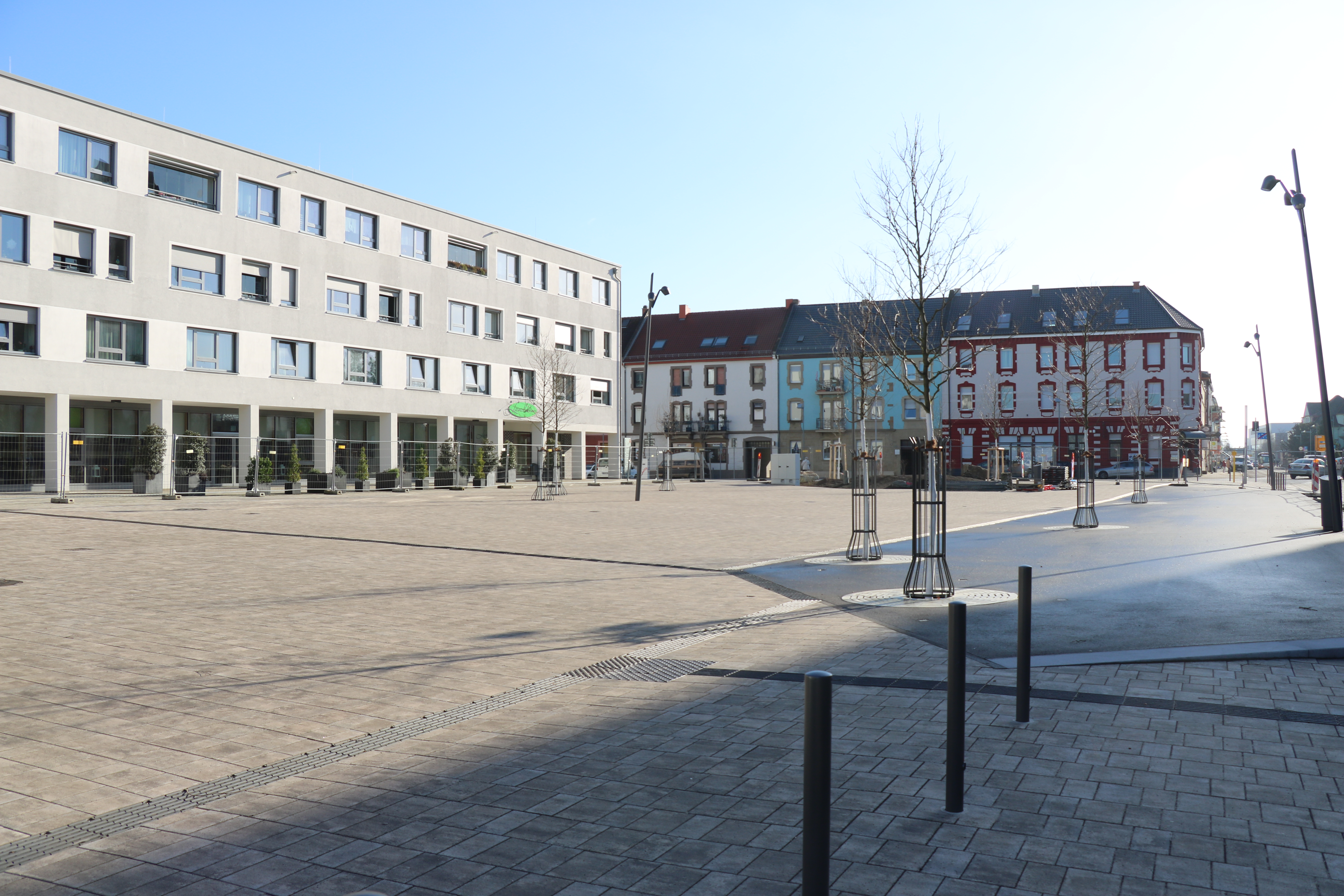 Bürgermeisterin Prof. Dr. Diana Pretzell (mitte), Bürgermeister Ralf Eisenhauer (4. v. l.) und Erster Bürgermeister Christian Specht (3. v. r.) freuen sich über die Fertigstellung des Taunusplatzes