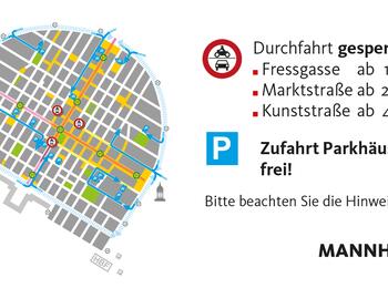 Ab dem 11. März gilt in der Mannheimer Innenstadt eine neue Verkehrsführung. Die Durchfahrt in der Fressgasse, Marktstraße und Kunststraße wird dann unterbrochen.