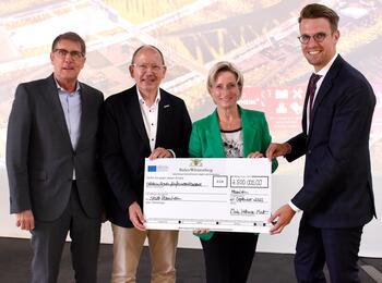 Auf dem Bild (v. l. n. r.): Wirtschaftsbürgermeister Michael Grötsch, Oberbürgermeister Christian Specht, Dr. Nicole Hoffmeister-Kraut (Wirtschaftsministerin Baden-Württemberg.