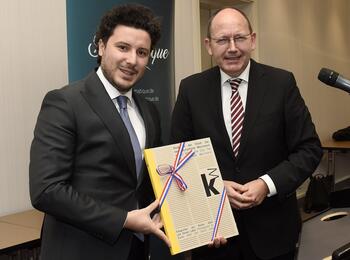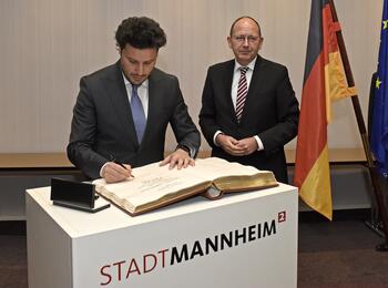 Dr. Dritan Abazović, stellvertretender Ministerpräsident von Montenegro, mit Christian Specht, Erster Bürgermeister der Stadt Mannheim, beim Eintrag in das Goldene Buch der Stadt Mannheim.