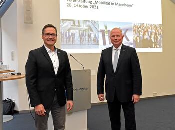 Bürgermeister Ralf Eisenhauer (links) tauschte sich bei einer Veranstaltung der IHK Rhein-Neckar mit IHK-Präsident Manfred Schnabel über die Mobilität in Mannheim aus.