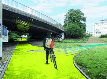 Die Neugestaltung des Fuß- und Radwegs auf der Kurt-Schumacher-Brücke soll zu einem neuen Fahrraderlebnis zwischen Mannheim und Ludwigshafen beitragen. Die Radroute soll unter anderem durch eine strahlende Bodenmarkierung besser sichtbar werden.