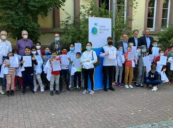 Von rechts hinten: Thomas Köber und Präsident Prof. Dr. Stefan Post vom Rotary Club Mannheim, der Schulleiter der Humboldt-Grundschule, Anderas Baudisch, Bürgermeister Dirk Grunert, der Vorsitzende des Fördervereins Neckarstadt-West, Reinhold Götz, und der Leiter der Neckarschule, Peter Deffaa, gemeinsam mit den Kindern.