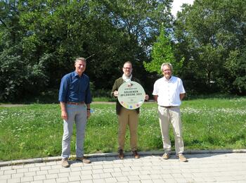 Bürgermeister Dirk Grunert (Mitte) freut sich mit Markus Roeingh (li.) und Klaus Schwennen vom Eigenbetrieb Stadtraumservice über den Gewinn der Goldenen Wildbiene 2021.