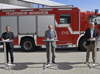 Dekan Karl Jung, Erster Bürgermeister Christian Specht und Dekan Ralph Hartmann (v.l.n.r.) bei der Unterzeichnung des Notfallseelsorge-Vertrags auf dem Hof der Hauptfeuerwache in Neckarau.