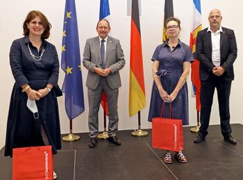 Generalkonsulin Dr. Ilde Valérie Gorguet, Erster Bürgermeister und Vorsitzender des Institut Français in Mannheim, Christian Specht, Generalkonsulin Catherine Eliane Veber und Honorarkonsul Folker R. Zöller in der Kunsthalle Mannheim (v.l.n.r.)