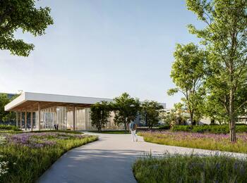 Das quadratische Pfortengebäude von Roche in Mannheim entsteht inmitten eines öffentlich zugänglichen Landschaftsparks.