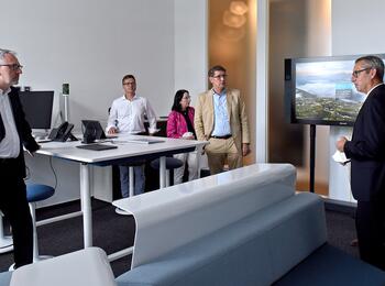 Stephan Mauer, Geschäftsführer des Bechtle IT-Systemhaus Mannheim (2.v.r.), und Helge Höhn, Dienstleistungsleiter Business Services bei Bechtle (1.v.r.), demonstrieren Oberbürgermeister Dr. Peter Kurz, Baubürgermeister Ralf Eisenhauer, der Fachbereichsleiterin der Wirtschaftsförderung Mannheim, Christiane Ram, und Wirtschaftsbürgermeister Michael Grötsch ihre digitalen Kommunikationsmöglichkeiten.