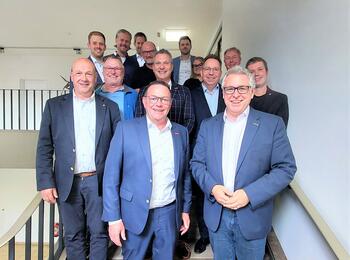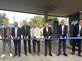 Eröffneten gemeinsam den MVV eLadepark Columbus: (v.l.n.r.:) Achim Judt, Geschäftsführer MWSP, Daniel Jung, Geschäftsführer MVV Regioplan, MVV-Vorstand Ralf Klöpfer, Oberbürgermeister Christian Specht, MVV-Vorstandsvorsitzender Dr. Georg Müller und Karl-Heinz Frings, Geschäftsführer GBG Unternehmensgruppe. Foto: MVV