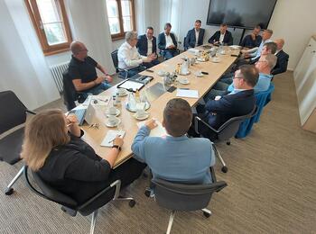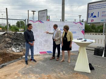 Oberbürgermeister Christian Specht (Mitte), Erste Bürgermeisterin Prof. Dr. Diana Pretzell und Bürgermeister Ralf Eisenhauer zeigen die Route des Radschnellwegs, der Mannheim künftig mit Viernheim verbinden soll