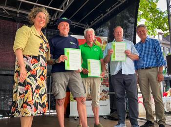 Erste Bürgermeisterin Prof. Dr. Diana Pretzell und Eigenbetriebsleiter Markus Roeingh (rechts) vergeben die Sonderpreise für die Personen und Vereine, die sich in besonderer Weise für Sauberkeit in der Stadt einsetzen, v.l.: