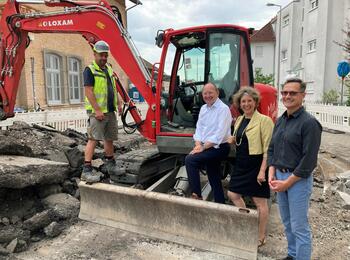 Oberbürgermeister Christian Specht, Erste Bürgermeisterin Prof. Dr. Diana Pretzell und Bürgermeister Ralf Eisenhauer vor dem Bagger, der bereits ein erhebliches Stück der Straße für den Radschnellweg bearbeitet hat