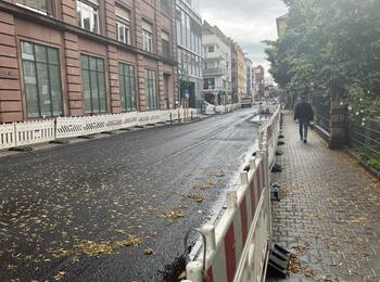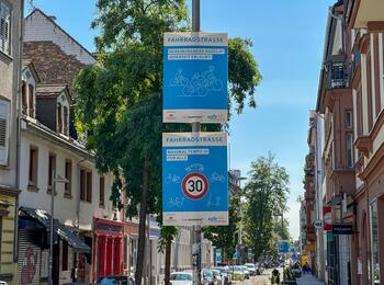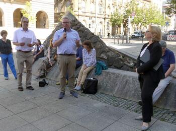(v.l.) Dr. Jens Bortloff, Bürgermeister Thorsten Riehle und Helen Heberer vor dem Scherbenbrunnen, an dem eine Bronzetafel mit dem bekannten Mannheim-Zitat aus Goethes „Hermann und Dorothea“ an den Dichter und Denker erinnert
