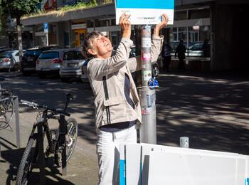 Umweltministerin Thekla Walker bei der symbolischen Scheckübergabe an Bürgermeister Dirk Grunert.