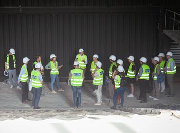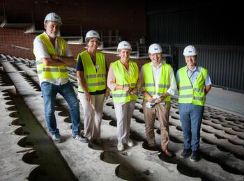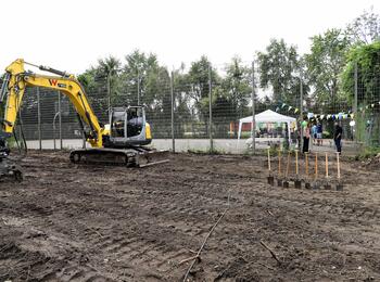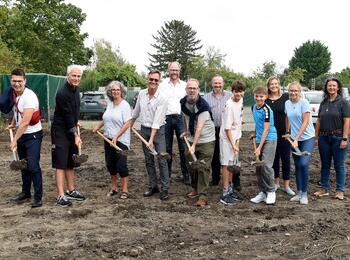 Vertreterinnen und Vertreter von Politik, der Elterninitiative und dem Archtiekturbüro - darunter die Bürgermeister Dirk Grunert und Ralf Eisenhauer - nahmen den offiziellen ersten Spatenstich für den Neubau eines Jugendtreffs in Neuhermsheim vor.