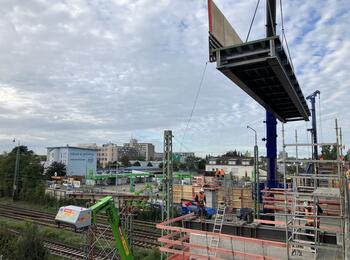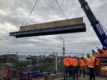 Die ersten Teile der Behelfsbrücke für die Erneuerung der BBC-Brücke werden eingehoben.