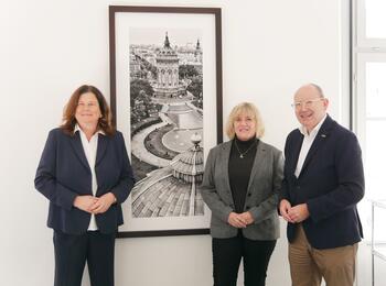Aufsichtsratsvorsitzende Verena Eisenlohr (l.) und Oberbürgermeister Christian Specht (r.) stellen Martina Braun als neue Stadtmarketing-Geschäftsführerin vor.