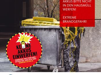 Batterien und Akkus oder Elektrogeräte, in denen Akkus verbaut sind, gehören in keinem Fall in den Hausmüll. Eine kostenfreie Rückgabe ist im Handel oder bei den städtischen Recyclinghöfen möglich.