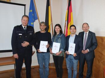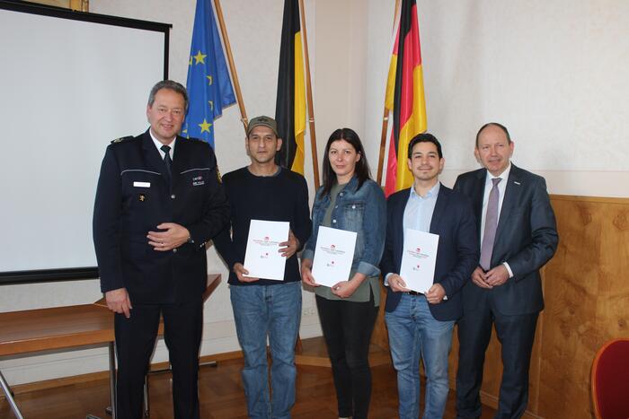 Ehrende und Geehrte bei der Auszeichnung "Beistehen statt rumstehen" des Vereins "Sicherheit in Mannheim e.V." (von links): Polizeipräsident Thomas Köber, Kamran Alijani-Moamar, Tina Gründer, Timur Özcan und Erster Bürgermeister Christian Specht.