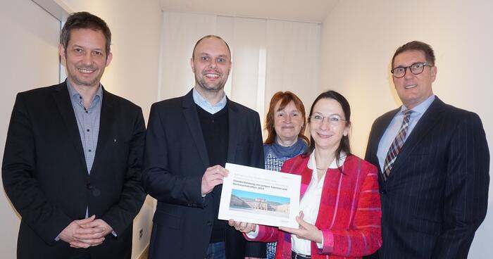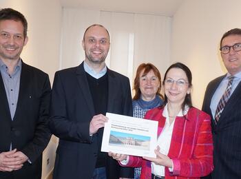 Auf dem Bild: Harald Pfeiffer (Fachbereich für Wirtschafts- und Strukturförderung), Dirk Obermeier (Spiegel Institut Mannheim), Anett Jakob-Jüngling (Fachbereich für Wirtschafts- und Strukturförderung), Christiane Ram (Leiterin Fachbereich für Wirtschafts- und Strukturförderung) und Wirtschaftsbürgermeister Michael Grötsch.