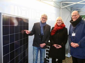 von links nach rechts: Herr Heißler, der einen Zuschuss für seine Solaranlage bekam, Frau Schönfelder (Geschäftsführerin Klimaschutzagentur Mannheim) und Herr Demuth (Bereichsleiter Vertrieb Regional MVV Energie)