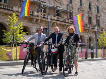 Freuen sich auf drei Wochen STADTRADELN 2025 (von links): Bürgermeister Ralf Eisenhauer, Oberbürgermeister Christian Specht und Erste Bürgermeisterin Prof. Dr. Diana Pretzell.