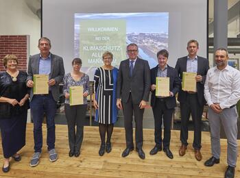 Bürgermeisterin Felicitas Kubala (4. v. l.) und Oberbürgermeister Dr. Peter Kurz (5. v. l.) begrüßen die neuen Mitglieder der Klimaschutz-Allianz