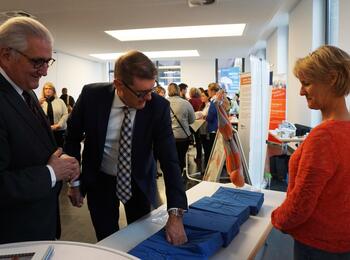 Ulrich Manz, Vorsitzender der Geschäftsführung in der Agentur für Arbeit Mannheim, und Sozialbürgermeister Michael Grötsch testen ihr Wissen über die Physiotherapie am Stand der Universitätsmedizin Mannheim.