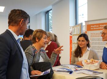 Irmgard Otto vom Referat Fachkräftesicherung im Ministerium für Wirtschaft, Arbeit und Wohnungsbau und Dr. Markus Gomer, Leiter Bildung, Gesundheit, Arbeitsmarkt bei der Metropolregion Rhein-Neckar GmbH, informieren sich am Stand der Universitätsmedizin Mannheim.