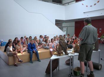 Schülerinnen und Schüler der Vogelschule lauschen gespannt den Erklärungen des Vogelexperten.