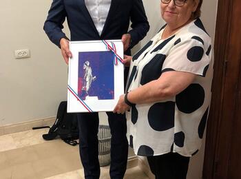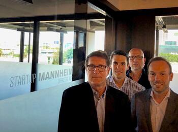 v.l.n.r. Michael Grötsch, Jonathan Glick, Christian Sommer, Nikolas Löbel vor dem Kontaktbüro von Startup Mannheim im Startup Center Mindspace in Tel Aviv