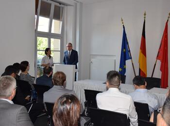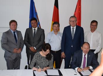 Rong Zhang, stellvertretende Geschäftsführerin von Yuxinou (Chongqing) Logistics co., LTD und Christian Specht, Erster Bürgermeister der Stadt Mannheim, unterzeichnen das Memorandum of Understanding. Im Hintergrund: Stadtrat Bernd Kupfer, Pablo Gándara von der EU-Kommission, Xue Xiong, Generaldirektor Development and Reform Commission of Chongqing Municipality, Oberbürgermeister Dr. Peter Kurz und Stadtrat Ralf Eisenhauer (v.l.n.r.)