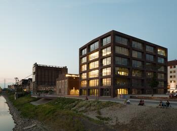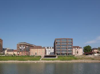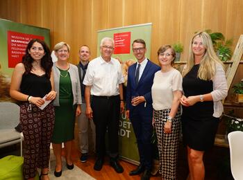 Oberbürgermeister Dr. Peter Kurz, Karl-Heinz Frings, Geschäftsführer der GBG - Mannheimer Wohnungsbaugesellschaft, sowie Vertreter aus dem Gemeinderat und der beteiligten Bauunternehmen geben mit dem ersten Spatenstich den Startschuss für den Bau des Neuen Technischen Rathauses im Glücksteinquartier.