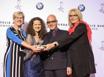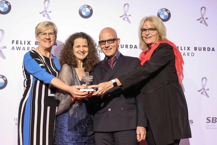 Umweltbürgermeisterin Felicitas Kubala mit dem Felix Burda Award und den Gesundheitskoordinatoren Christina Sandner, Thorsten Weingärtner und Martina Oswald. (v. l. n. r.)