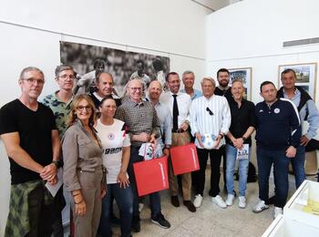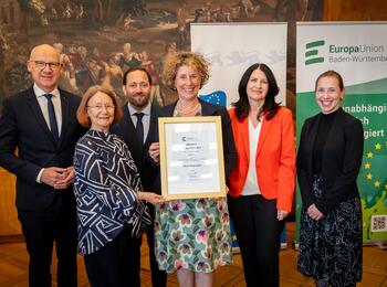 V.l.n.r. Bezirksbürgerserviceleiterin Olita Steger, Manuel Wamser, Leiter der DRK-Einrichtungen Tafel und Second Hand, Bürgermeister Thorsten Riehle und Christiane Hammoudi, Geschäftsführerin DRK Kreisverband Mannheim e.V., vor der Tafel in der Alphornstraße.