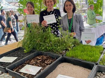 Erste Bürgermeisterin Prof. Dr. Diana Pretzell (Mitte) und die Geschäftsführerinnen der Klimaschutzagentur, Eileen Roth (links) und Marianne Crevon (rechts) bei der Eröffnung der "Blumme und Bääm" 2025.
