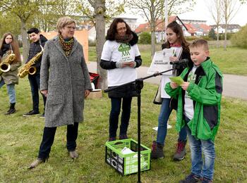 Junge Botschafter von Plant-for-the-Planet beim Vortrag im Rahmen der Baumpflanzfeier im Bürgerpark