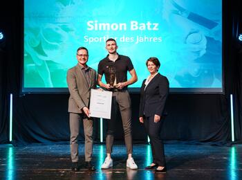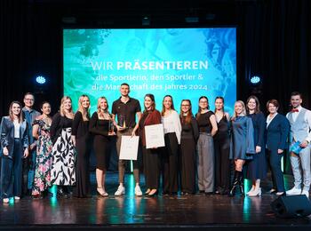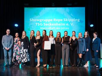 Sportbürgermeister Ralf Eisenhauer (links) und Sportkreis-Vorsitzende Dr. Sabine Hamann (rechts) mit der Mannschaft des Jahres 2024, der Showgruppe Rope Skipping der TSG Seckenheim e.V., und dem Sportler des Jahres Simon Batz (mitte).