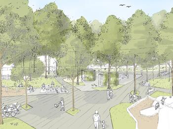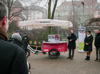 Bei der offiziellen Übergabe der Informationsstele am Ludwig-Frank-Denkmal im Unteren Luisenpark: v.l.n.r.: David Hellge, Reichsbanner Schwarz-Rot-Gold, Prof. Dr. Philipp Gassert, Universität Mannheim, Christian Soeder, Reichsbanner Schwarz-Rot-Gold, Dr. Harald Stockert, Direktor des MARCHIVUM, Gottfried Niedhard, emeritierter Professor der Universität Mannheim, Thorsten Riehle, Kulturbürgermeister, Luisa Heese, stellvertretende Direktorin der Kunsthalle Mannheim, und Dr. Andreas Schenk, MARCHIVUM.