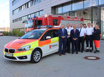Stellten den neuen Notarztstandort an der Hauptfeuerwache Mannheim vor (von links): Erster Bürgermeister Christian Specht, Karlheinz Gremm, Amtsleiter Feuerwehr Mannheim, Tobias Fellhauer, Leiter Malteser Rettungsdienst Heidelberg, Prof. Dieter Schilling, Ärztlicher Direktor Diakonissenkrankenhaus, Christoph Scherer, Integrierte Leitstelle Mannheim, Peter Neuhauer, Bezirksgeschäftsführer Malteser Rettungsdienst Baden-Württemberg, Jörg Oberkinkhaus, Feuerwehr Mannheim, Andreas Simon, Rettungswachleiter, Prof. Andreas Pitz, Koordinator Rettungsdienst, sowie Ulrike Dachsel, notärztliche Standortleiterin.