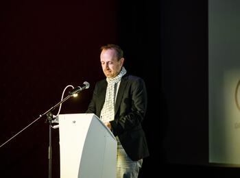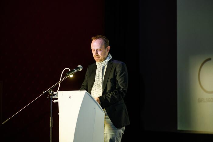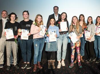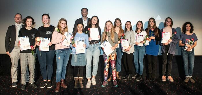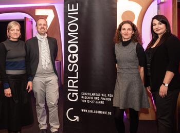 Preisverleihung Girls go Movie 2019 - die Preisträgerinnen mit Bürgermeister Dirk Grunert (links im Bild) und Dr. Wolfgang Kreißig, Präsident der Landesanstalt für Kommunikation Baden-Württemberg (LFK)