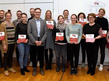 Sportbürgermeister Ralf Eisenhauer und Projektverantwortlicher Kolja Müller-Späth mit den Teilnehmenden von "Schwimmfix" im Schuljahr 2024/2025.