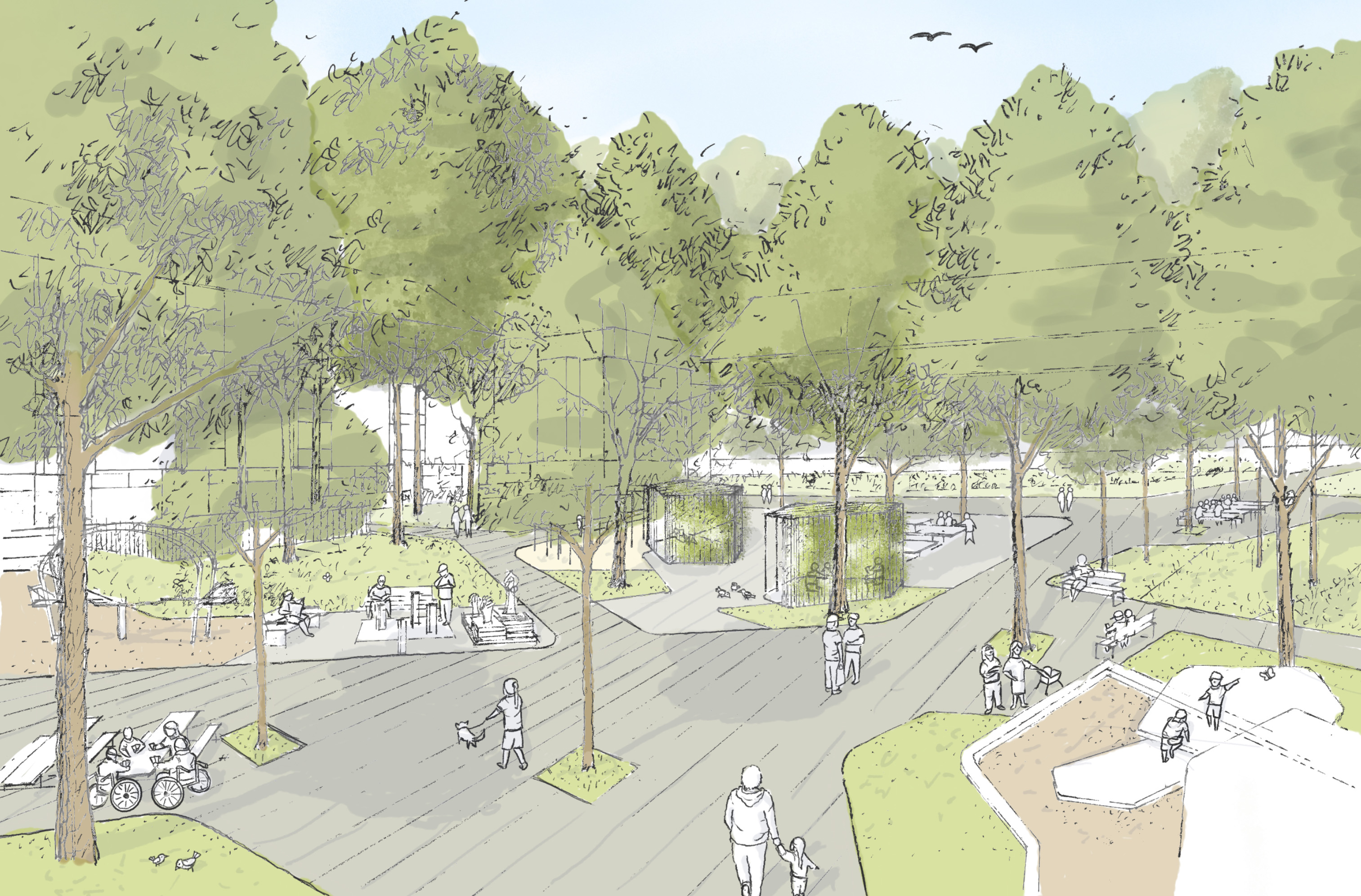 „Auf dem neuen Swanseaplatz wird es im Vergleich zu jetzt mehr als doppelt so viel begrünte Fläche geben. Dazu pflanzen wir 22 neue Bäume und legen begrünte Pergolen an, die im Sommer Schatten spenden“, ergänzt Specht und betont: „Durch die Begrünung heizt sich der Swanseaplatz am Tag weniger auf und kühlt in der Nacht schneller ab, was in den dicht bebauten Quadraten besonders wichtig ist.“ Auch an Tiere wurde gedacht: Sie finden an einem neuen Spielelement mit Wasser etwas zu trinken und die Vögel bekommen Nisthilfen an den Bäumen. Außerdem wird es auf einer Sandfläche eine Trockenmauer als Lebensraum für Eidechsen und Insekten geben.